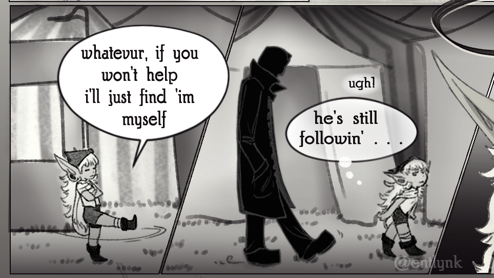 i tugged on where it looked like Bricky’s coat to get his attention. i can’t even know how to describe how a shadow feels, and he didn’t have no smell. he seemed irritated at the sight of me and wasn’t being helpful, so i told him “fine! ill go find my better Bricky all by myself!” i sniff the air and catch Bwicky’s rancid smell (its barely mixed with smell-good herbs so i know it can’t be any other rando cadaver) and head in that direction. yet ShadowBricky still follows me?? hmph whatever. soon i am met by a floating eye — Bwicky was looking for me too?! awh yayyy~
